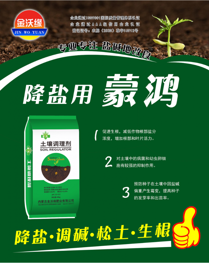 盐碱地改良的核心困境在于其复杂的“盐-碱-板-瘦”交织问题。传统方法如灌水洗盐虽能短期降低盐分,却常导致水资源浪费 且难以持续;施用石膏等碱性改良剂可置换钠离子,但对PH值极 高的苏打型盐碱地效果有限。蒙鸿土壤调理剂,高分子特 殊的材料具有强大的酸碱调节功能,在盐碱环境中遇水则迅速释放氢氧根或氢离子来调节周围土壤酸碱度趋向中性。