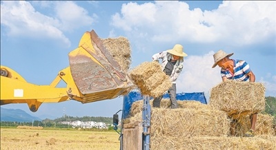 10月9日,湖北省黄冈市英山县金家铺镇的农田里,农户在装运水稻秸秆。秋收时节,英山县加大水稻秸秆回收力度,将秸秆用于生产菌材、饲料等,既保护了生态环境,又带动了农户增收。