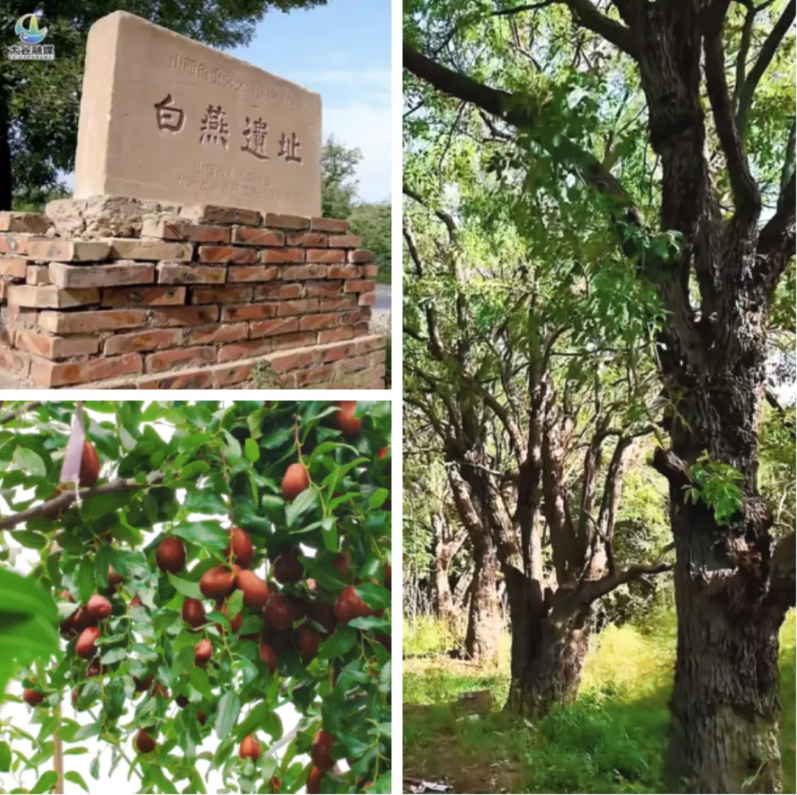 至今太谷境内仍完好留存着3000余株树龄超百年的古枣树。位于太谷白燕遗址箕园中名为“枣皇”“枣后”“枣妃”三棵古枣树,树围达3米以上,树龄超千年,树干粗壮、枝丫苍劲,树皮纹路如岁月勋章。每年枣花盛开时满树芬芳,秋季硕果累累,不仅是壶瓶枣种植史的“活见证”,更成为独特的生态景观与文化地标,吸引游客打卡,感受千年枣文化的厚重。