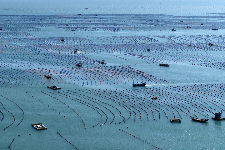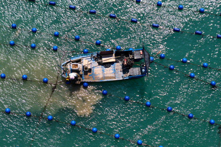 近日,福建省福州市连江县筱埕镇海域的海洋牧场呈现出一派繁忙的秋日海上耕作景象。