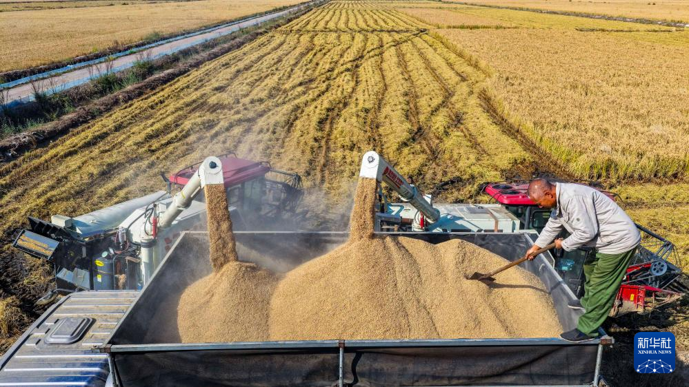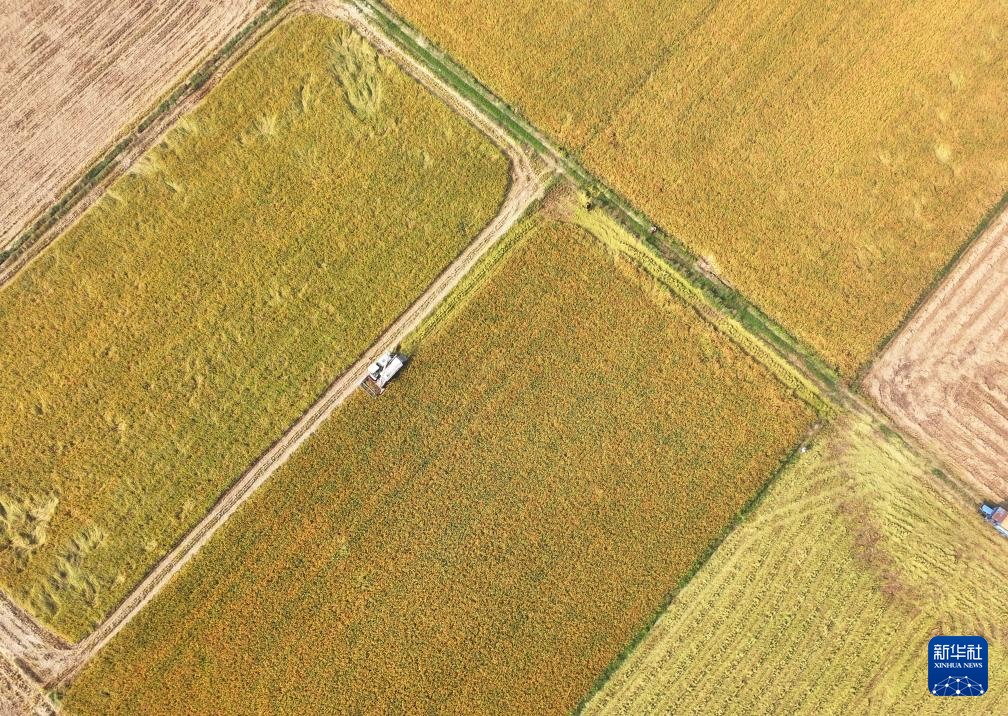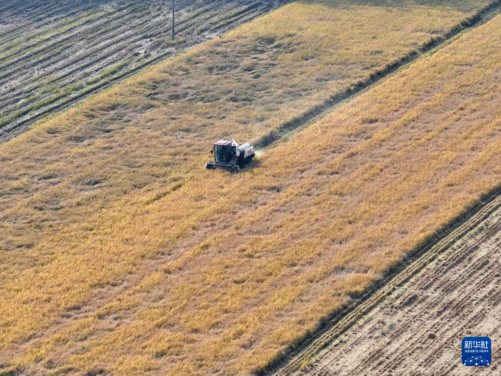 10月28日,湖南省永州市道县梅花镇棠下村,农机手驾驶机械收割晚稻(无人机照片)。新华社发(蒋克青 摄)