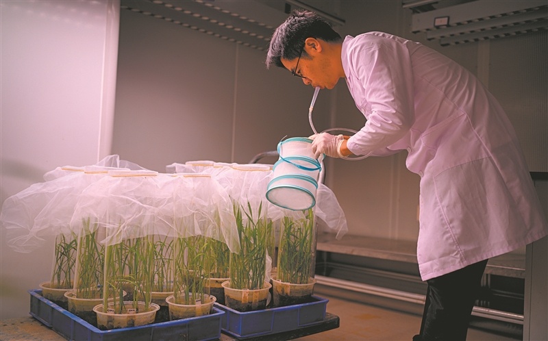 2025年3月30日,位于三亚的中国农业科学院国家南繁研究院,水稻科学家用室内饲养的稻飞虱,对野生稻及部分栽培稻幼苗进行抗虫鉴定,筛选抗虫资源及克隆优良抗虫基因。