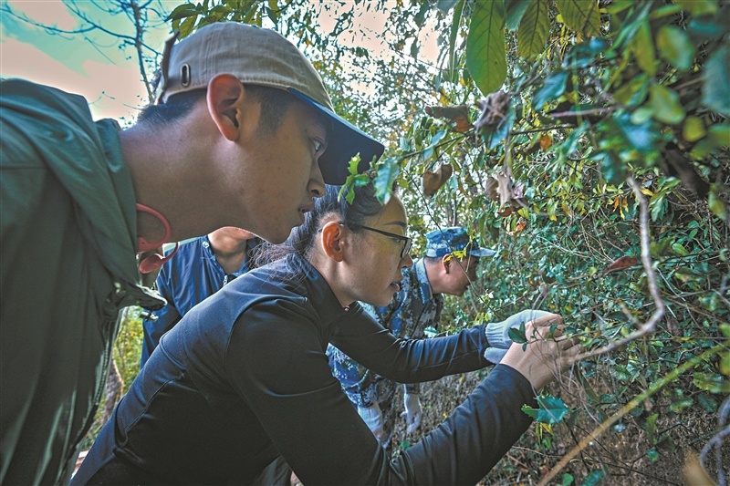 2024年1月30日,野生稻科考队深入三亚山区密林寻找疣粒野生稻。疣粒野生稻生长于阳光充足且有一定遮阴的位置,寻找极其困难。