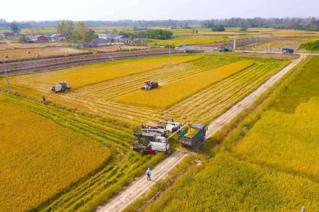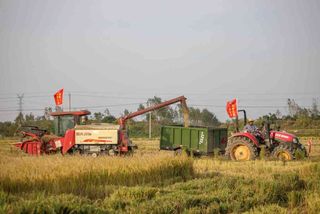 在金安灌片何山先导区,水稻秋收作业在统一部署下实行“分区包保”机制,管理人员分区驻守,统筹调配农机资源,合理调度作业安排,收割作业忙而不乱。在田间地头,轰鸣的收割机在金色稻浪中往来穿梭,烘干车间的设备昼夜不息,收割、运输、烘干环环相扣,全力保障收割进度,确保颗粒归仓。