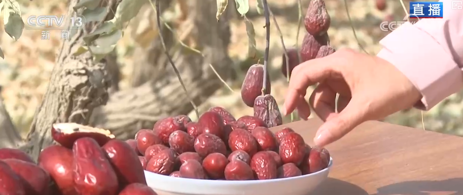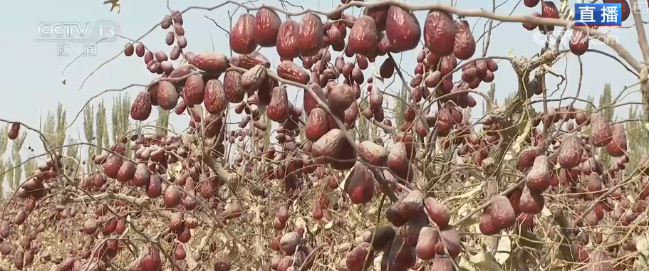 从现在一直持续到11月中旬,这里将进入繁忙的红枣采收阶段。在和田,红枣并不是一成熟就采收的。由于当地气候干燥,种植户会在红枣成熟后,让红枣留在树上自然风干。这种“吊干”方式会让红枣的甜度更高,同时也更便于储存和运输。这棵红枣树,部分红枣的表皮已经出现自然褶皱,正在脱水变干,这个样子就是差不多风干好,可以采收。
