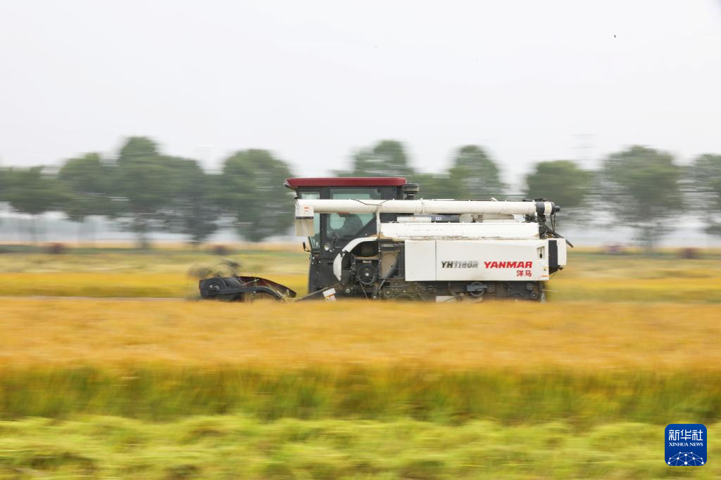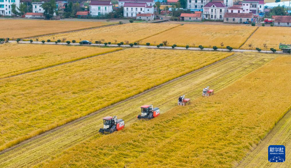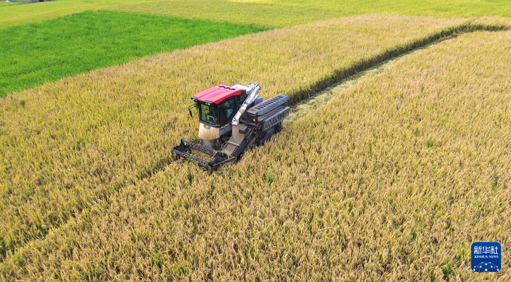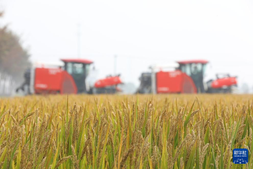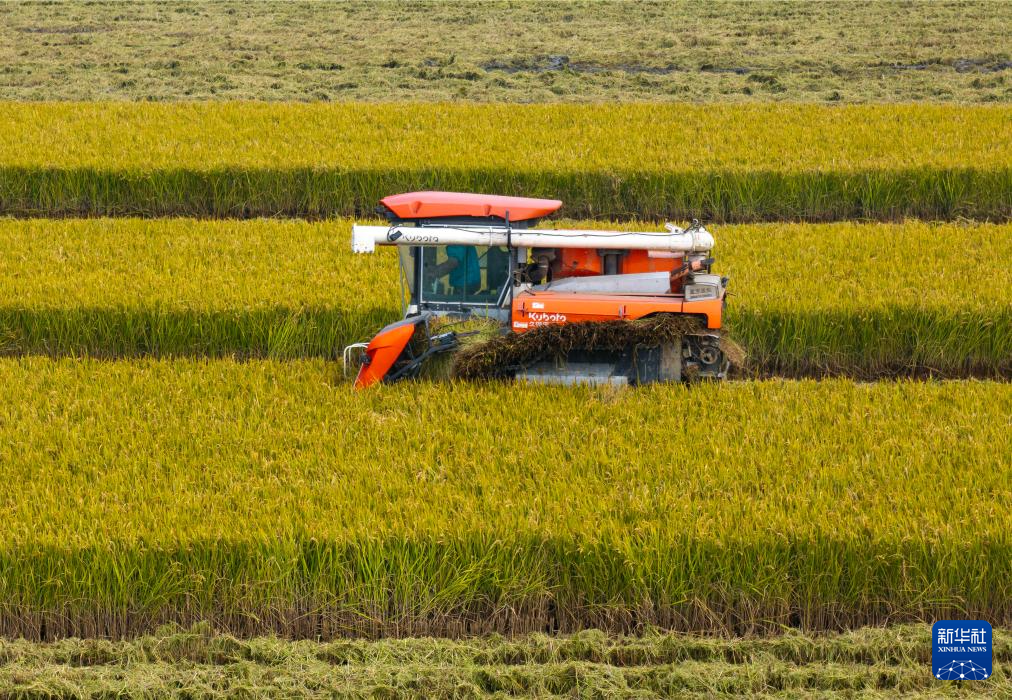 11月1日,在浙江省嘉兴市南湖区凤桥镇星火村,农机手驾驶收割机收割水稻。时下正值晚稻成熟期,各地农民抢抓农时收割水稻,田间一派繁忙景象。新华社发(金鹏摄)