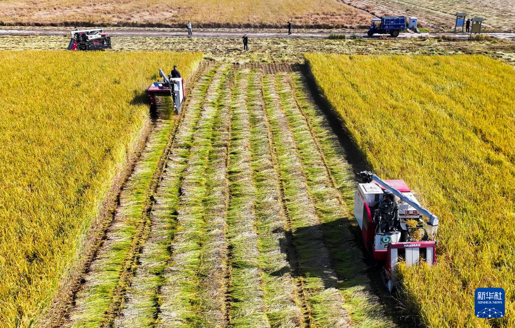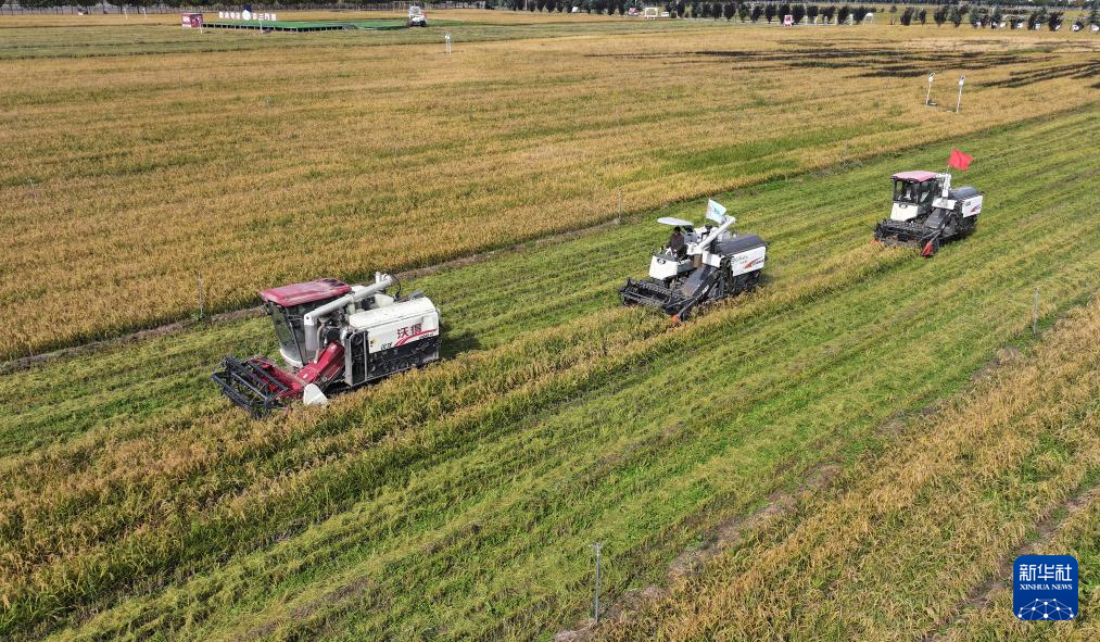 10月30日,在江苏省南通市通州区十总镇育民村高标准农田里,村民驾驶农机收割水稻(无人机照片)。时下正值晚稻成熟期,各地农民抢抓农时收割水稻,田间一派繁忙景象。新华社发(翟慧勇摄)