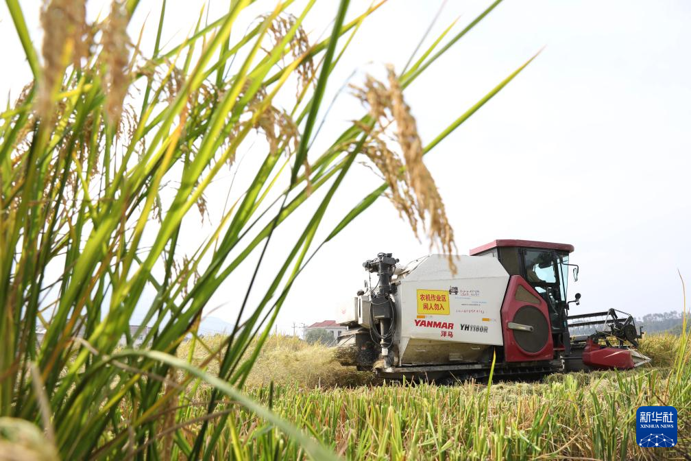 11月1日,在浙江省杭州市临安区天目山镇“天目粮仓”粮食功能区,农机手驾驶收割机抢收水稻。时下正值晚稻成熟期,各地农民抢抓农时收割水稻,田间一派繁忙景象。新华社发(胡剑欢摄)