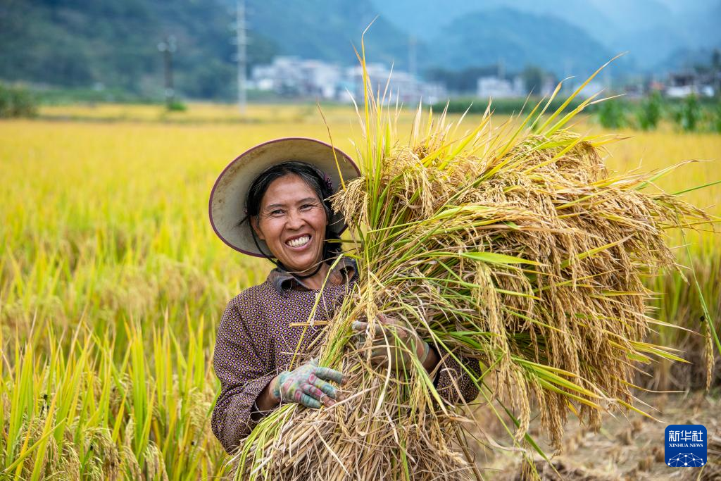 10月30日,广西靖西市禄峒镇大院村农民在收割晚稻。时下正值晚稻成熟期,各地农民抢抓农时收割水稻,田间一派繁忙景象。新华社发(赵京武摄)