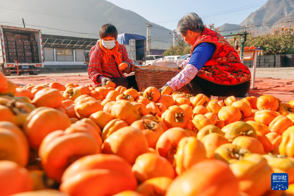 11月1日,河北省遵化市娘娘庄镇芦各寨西山村农民在场院挑选柿子。新华社发(刘满仓 摄)