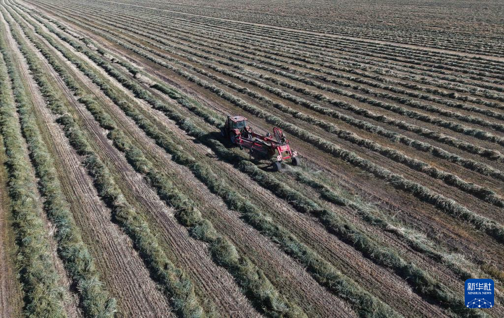 11月1日,工人驾驶拖拉机在甘肃山丹马场二场田间翻晒燕麦草(无人机照片)。新华社发(陈礼 摄)