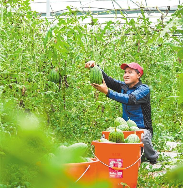 11月3日,江西省抚州市临川区荣山镇荣山村,立体栽培的“空中西瓜”迎来丰收,工作人员忙着采摘。郭昊 摄(中经视觉)