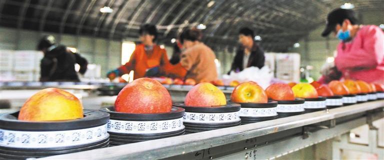 10月31日,山东省荣成市夏庄镇悦多果业苹果分拣车间,智能化分拣系统将苹果分为不同等级,精准高效。王福东 摄(中经视觉)