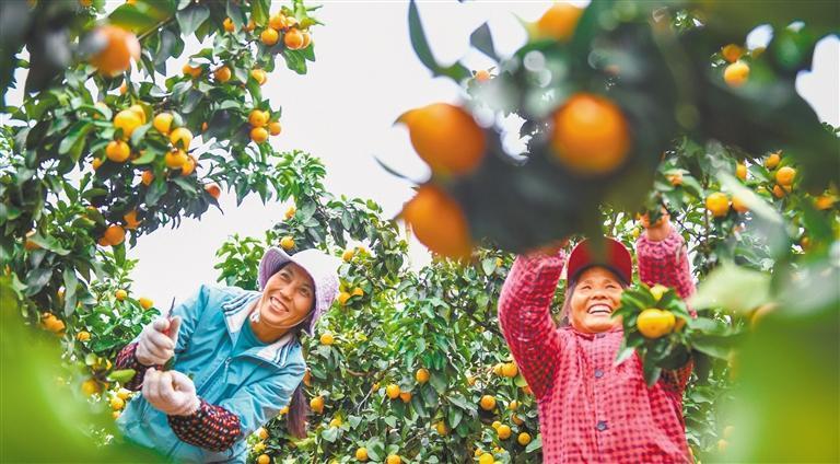 11月2日,湖南省永州市道县蚣坝镇兴桥村,砂糖橘树挂满沉甸甸的果实,果农穿梭在果树间,脸上洋溢着丰收的喜悦。蒋克青 摄(中经视觉)