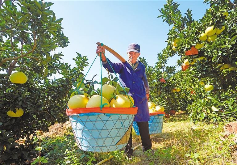 10月23日,浙江省玉环市清港镇文旦柚种植基地,果农在搬运文旦柚。今年,玉环2.9万亩文旦柚预计总产量3.02万吨,产值超4亿元。段俊利 摄(中经视觉)