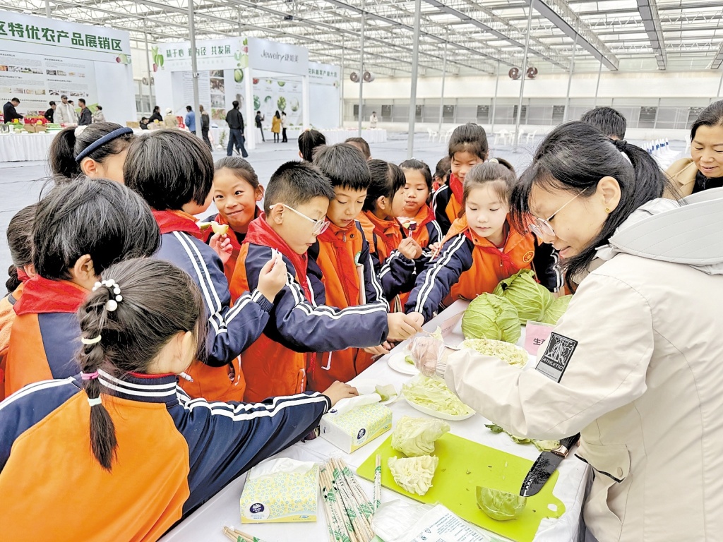 饱了眼福还要饱口福。十几名学生随后来到试吃区,桌上摆放着河北某农业科技开发有限公司研发的新品:生菜甘蓝和水果苤蓝。生菜甘蓝已经切好了两盘,一盘是原味,一盘拌上了沙拉酱。“这种生菜甘蓝口感脆甜,可以直接生吃哦。”工作人员介绍。“嗯,有点像生菜。”孩子们陆续上前品尝,边吃边交流。工作人员又拿起一个洗净的水果苤蓝,边切边说:“苤蓝其实跟甘蓝同种同源。这种苤蓝甜度比较高,吃起来很爽口。”刘语涵同学尝了一小口,顿时眼睛一亮,三口两口就把剩下的吃完了。孩子们你一片我一块,兴高采烈地换着样儿品尝,切好的生菜甘蓝和水果苤蓝跟不上吃的节奏。带队老师颜培莹忍不住说:“平时没见你们这么爱吃蔬菜。”