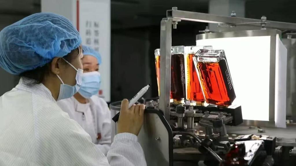 东阿阿胶阿拉善苁蓉集团的工作人员在对七味苁蓉酒进行瓶检。(阿拉善盟特色产业发展中心供图)