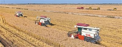 图为收割机在江苏连云港市大新农场收割耐盐碱水稻。王健民 摄(影像中国)