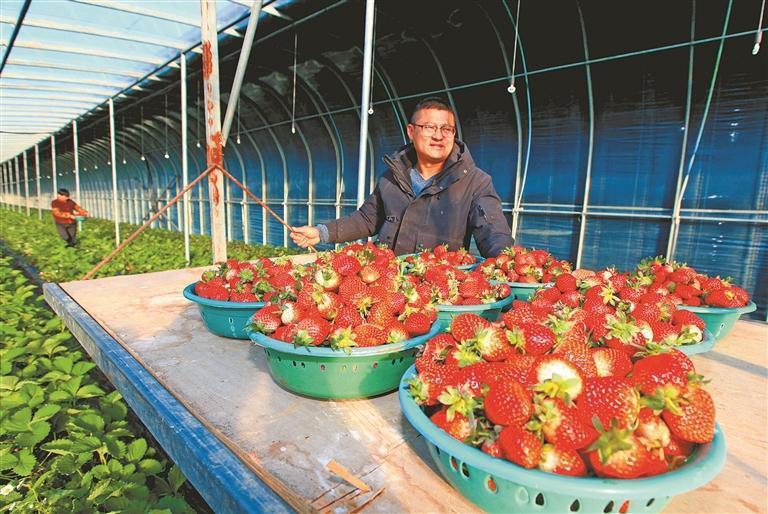 初冬清晨,薄雾还未散尽,江苏省徐州市铜山区新区街道的草莓大棚里已传来阵阵欢笑声。果农们小心翼翼地从绿叶间采摘下一颗颗饱满红润的草莓,轻轻放入篮中。“咱们的草莓在市场上一直受欢迎,因为上市早、品质好,现在每斤收购价格在50元左右。”温馨草莓园农场主宋子明的脸上洋溢着丰收的喜悦。在这里,草莓不仅是诱人的水果,更是带动农民增收、推动乡村振兴的“甜蜜产业”。