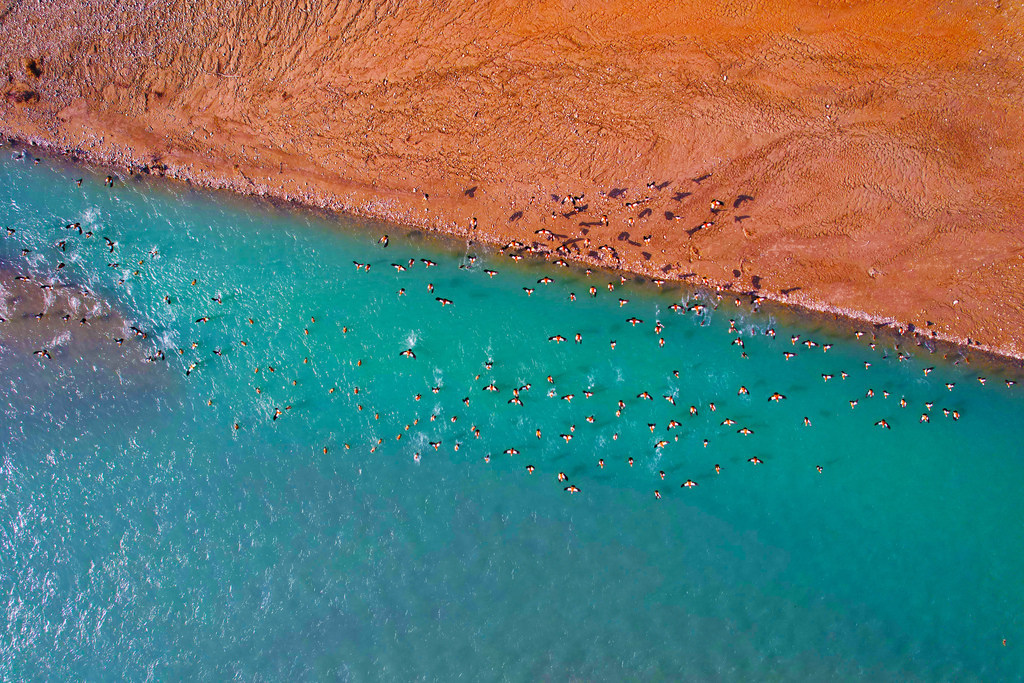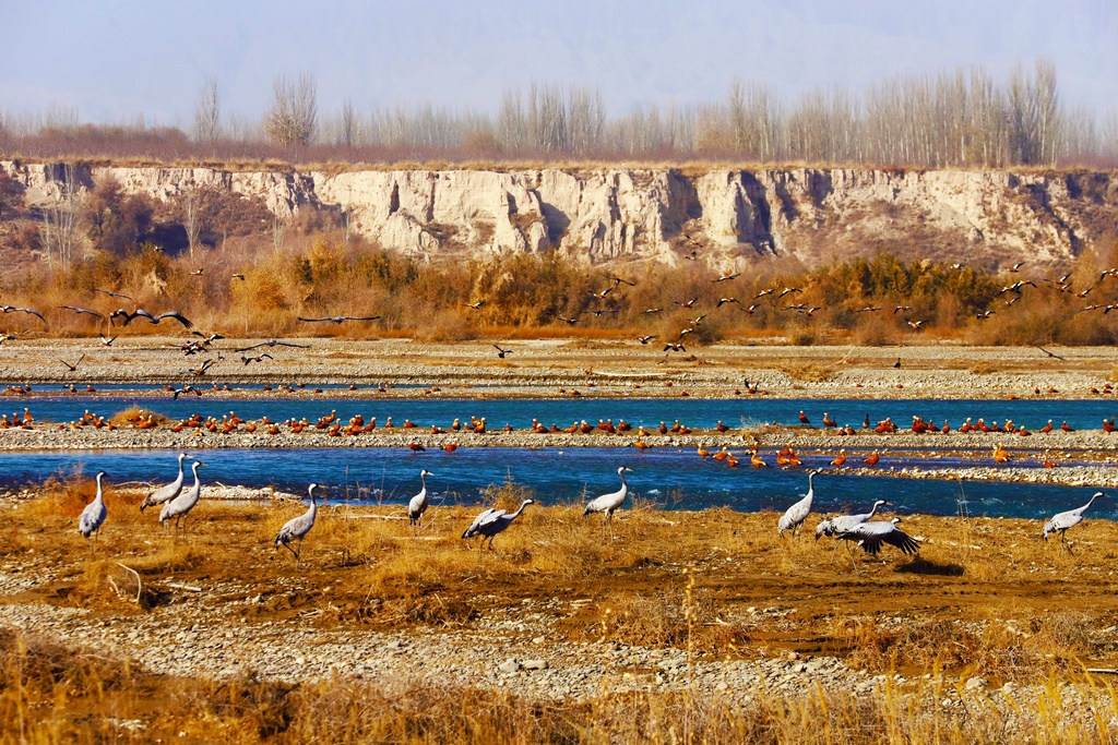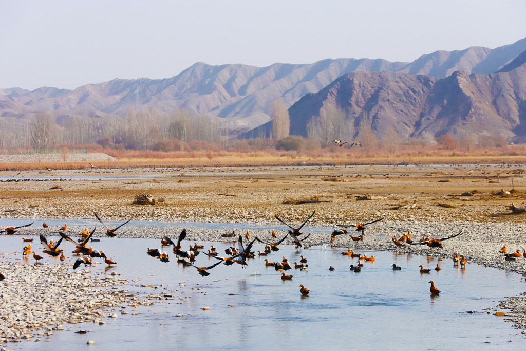冬日时节,新疆阿克苏地区乌什县托什干河国家湿地公园内,阳光洒落在清澈的河道上,碧绿的水流蜿蜒流淌,穿梭于金色的沙洲之间。千余只赤麻鸭成群栖息,时而驻足滩涂,时而振翅掠过水面,灰白色的鹤类等鸟类点缀其间,共同勾勒出一幅生机盎然的生态画卷。