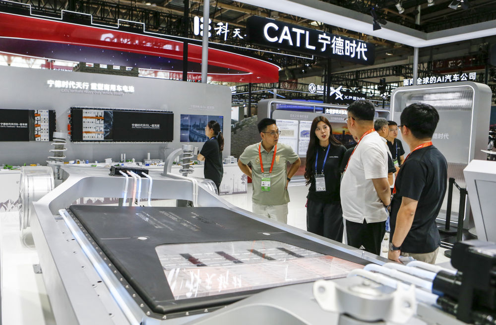 2025年7月16日,参会者在北京举行的第三届中国国际供应链促进博览会智能汽车链展区了解宁德时代神行PLUS电池。新华社记者 丁洪法 摄