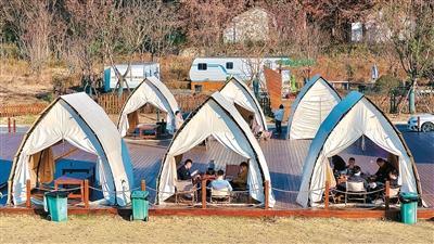 近年来,安徽省芜湖市繁昌区因地制宜打造农旅融合田园观光综合体,发展乡村旅游产业,促进农民增收致富。图为12月6日,游客在繁昌区孙村镇途居马仁山房车露营地休闲游玩。钱鸣 摄(人民视觉)