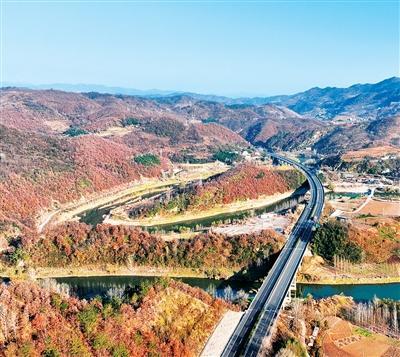 在湖北省十堰市房县,“四好农村路”、高速公路、国道互通连接,构成通达四方、城乡结网式交通网,形成“以路兴产业、以产业拓路、路产融合发展”的格局。图为房县红塔镇马栏村附近,高速公路、乡村公路与村组、产业基地互联互通。张启龙 摄(人民视觉)