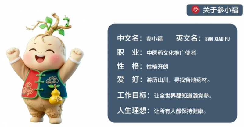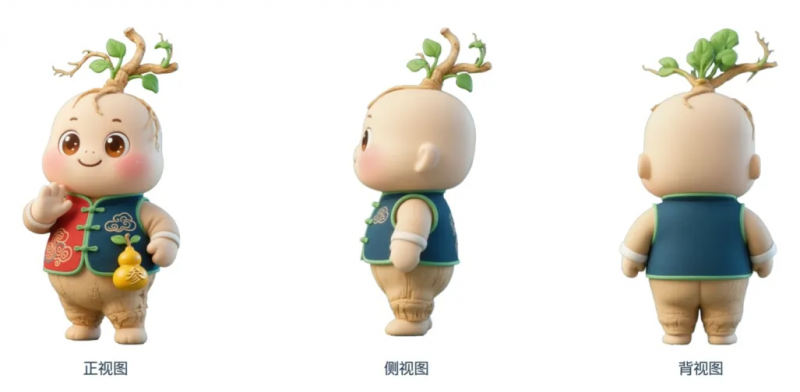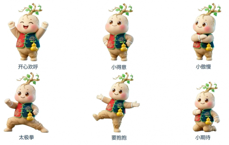 IP形象整体以拟人化的潞党参为原型,其身体形态模拟潞党参的根茎质感与形态特征,呈现出自然、质朴的视觉效果,直观点明“潞党参”这一核心主题,让受众能快速关联到中医药材本身。