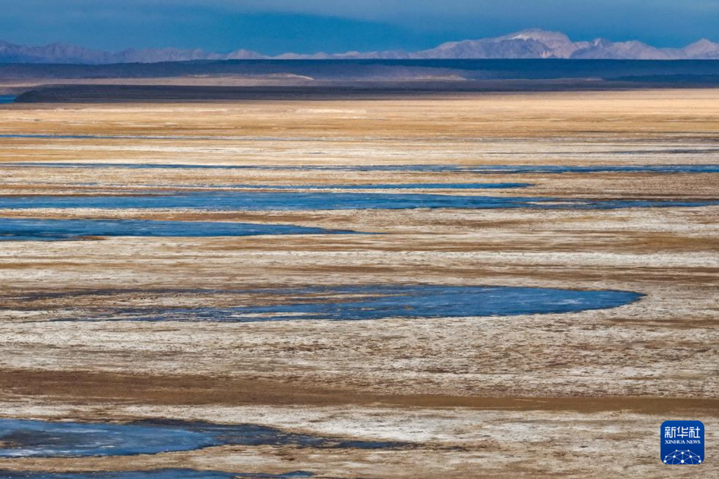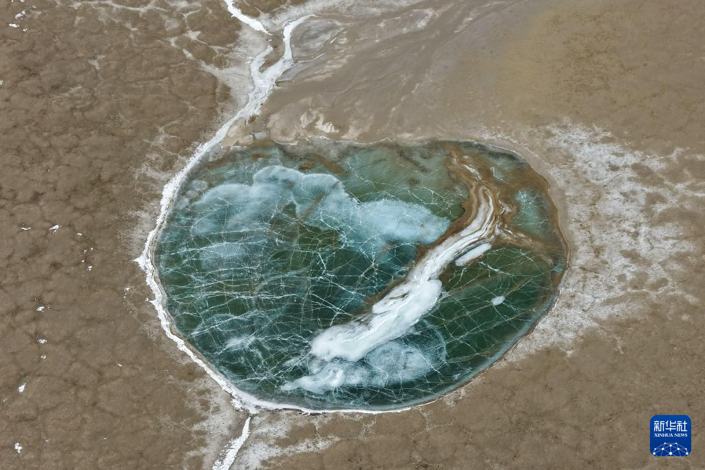 在阿尔金山国家级自然保护区,鲸鱼湖边的一处沼泽结了冰(无人机照片)。新华社记者 辛悦卫 摄