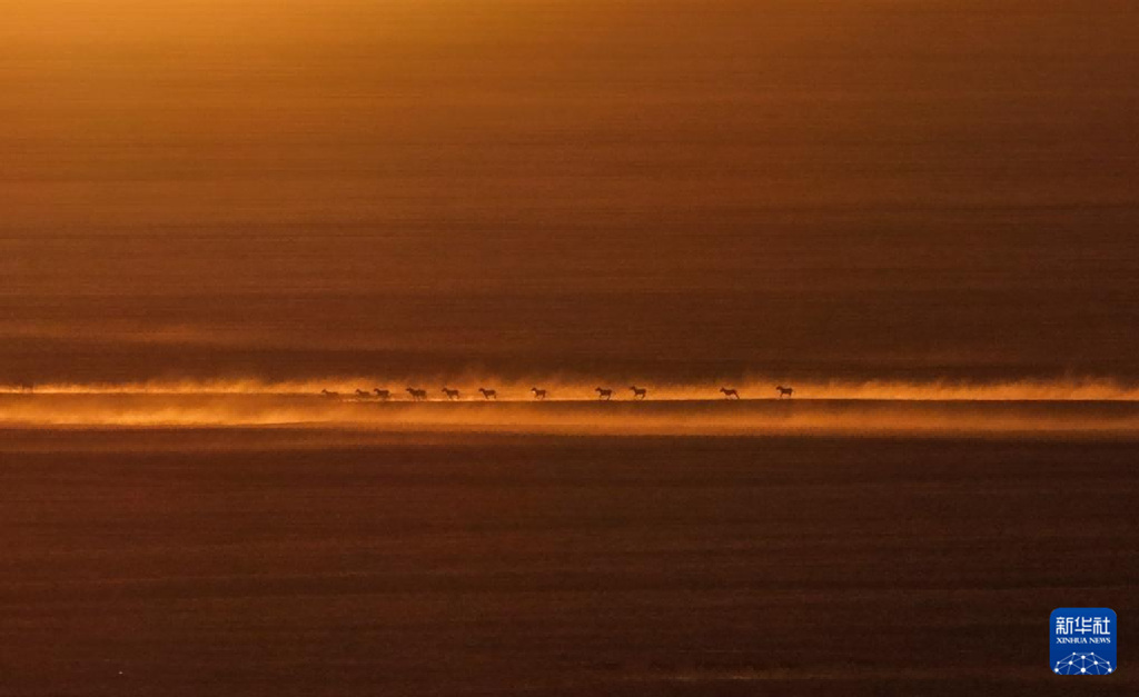 在阿尔金山国家级自然保护区,藏野驴奔跑在日出时的依协克帕提草原上(无人机照片)。新华社记者 辛悦卫 摄