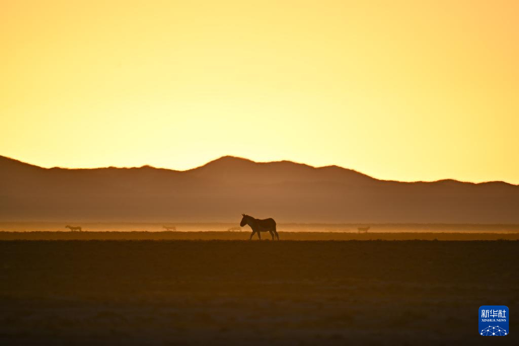 在阿尔金山国家级自然保护区,藏野驴在日出时的依协克帕提草原上觅食。新华社记者 辛悦卫 摄