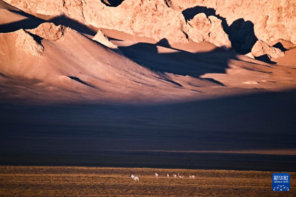 在阿尔金山国家级自然保护区,藏羚羊在狼牙山下的草原上觅食。新华社记者 辛悦卫 摄