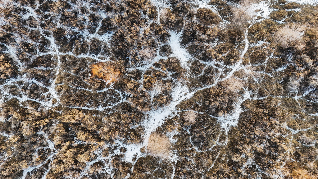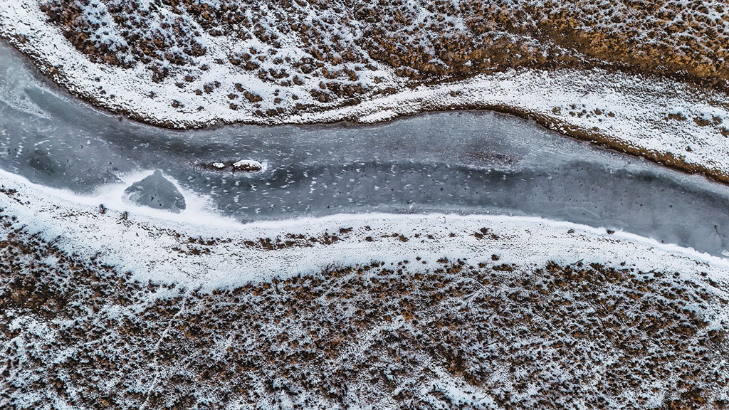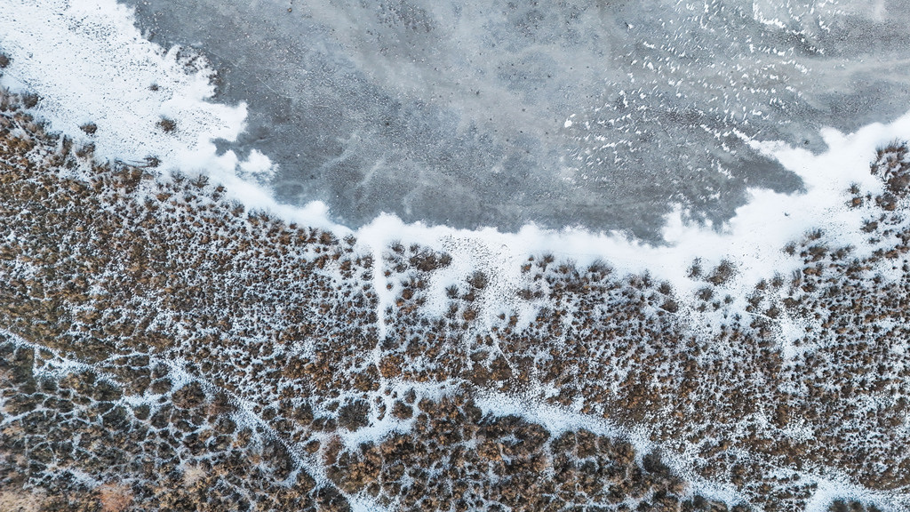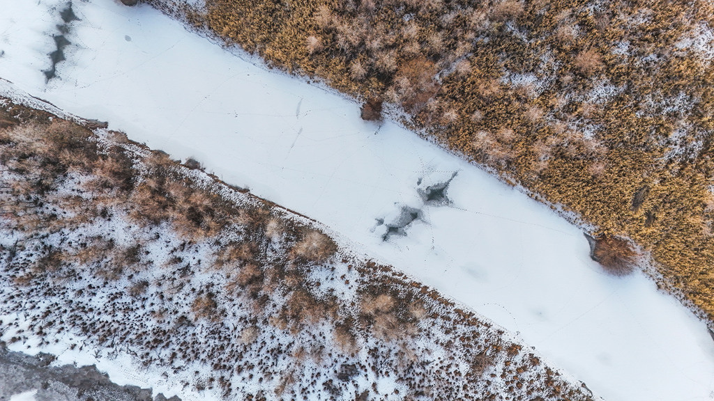 新疆维吾尔自治区昌吉回族自治州呼图壁县境内的小海子湿地,冬季呈现出静谧而富有诗意的自然景观。眼下,该湿地已全面进入冬季状态,湖面凝结成薄冰,沿岸区域覆盖着皑皑积雪。枯黄的水生植物在白雪映衬之下,显现出独特的审美意趣,共同构成了一幅典雅素净的冬日水墨画卷。