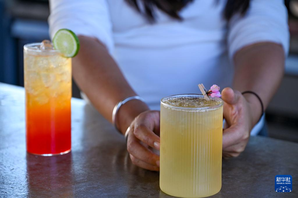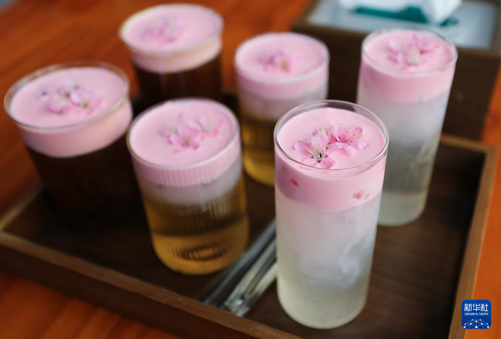 12月20日在大渡岗乡“热土工作室”拍摄的当地村民制作的樱花主题茶饮和咖啡。新华社记者 杜潇逸 摄