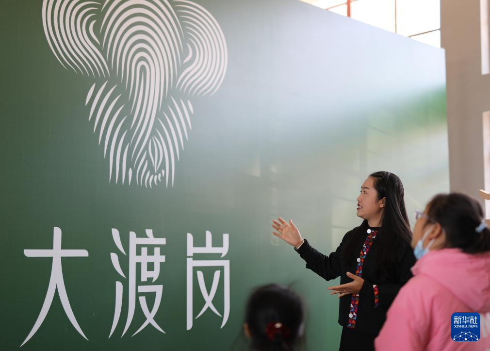 12月21日,魏春在大渡岗乡“热土工作室”为参加研学的小朋友介绍大渡岗乡的标识。新华社记者 杜潇逸 摄