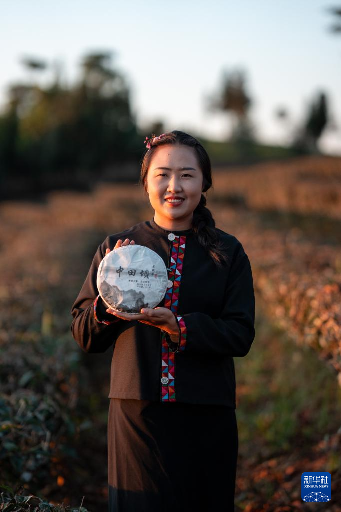 12月21日,魏春在大渡岗乡的茶园里推介当地生产的普洱茶饼。新华社记者 胡超 摄