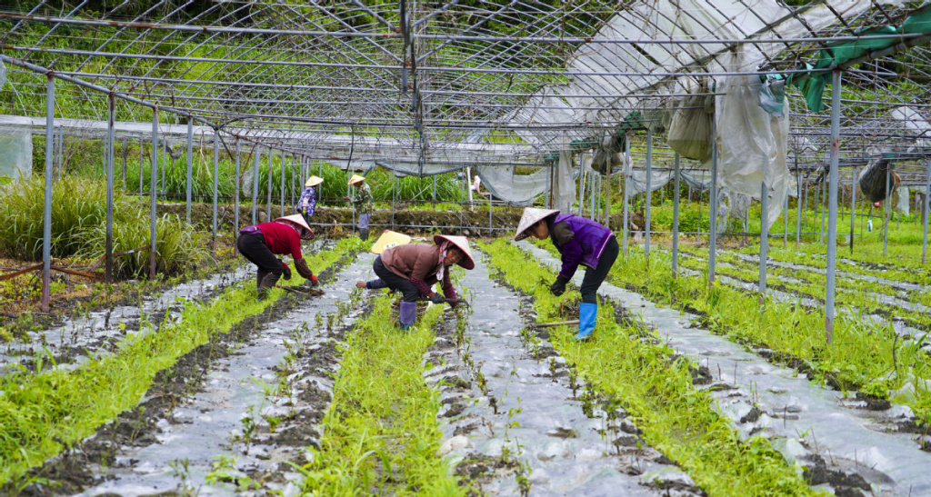 村干部在果蔬基地查看生长情况。饶如山 摄