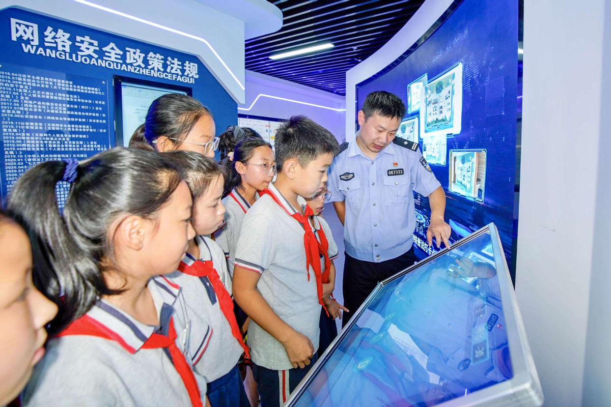 2025年9月15日,浙江省舟山市岱山县公安局民警与辖区高亭中学学生进行网络安全知识竞答互动。图片来源:新华社