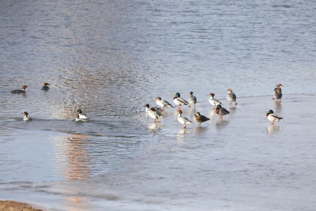 与此同时,被誉为“生态检验师”的斑头秋沙鸭种群数量显著增长。这种对水质和栖息环境要求极高的国家二级保护动物,因眼部黑斑酷似熊猫被称为“熊猫鸭”,在甘肃省内极为罕见。本次监测记录到22只斑头秋沙鸭集群活动,停留时间近一个月,而2025年初仅发现5只短暂停留。它们在湖面频繁潜水觅食,黑白羽色与赤麻鸭、绿头鸭交织成一幅动态生态画卷,成为湿地冬季的独特景观。