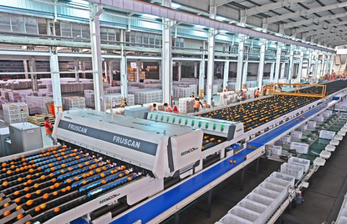 在安远县的江西果然食品智能化生产线上,工人正将脐橙转化为脐橙汁、精油、醋、酒、果胶、化妆品、酵素等多种产品,经过HPP超高压冷杀菌技术,让果汁保留99%原生风味与维生素C,实现“季产年销”,产品供应奈雪的茶、古茗等知名企业。