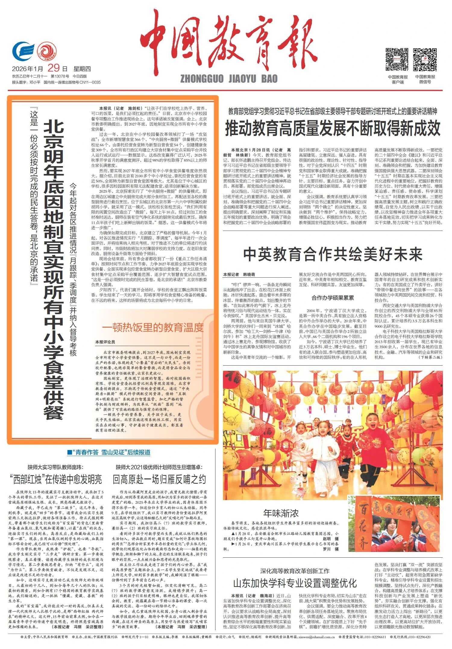 1月29日,中国教育报头版刊发了《北京明年底因地制宜实现所有中小学食堂供餐》。全文如下: