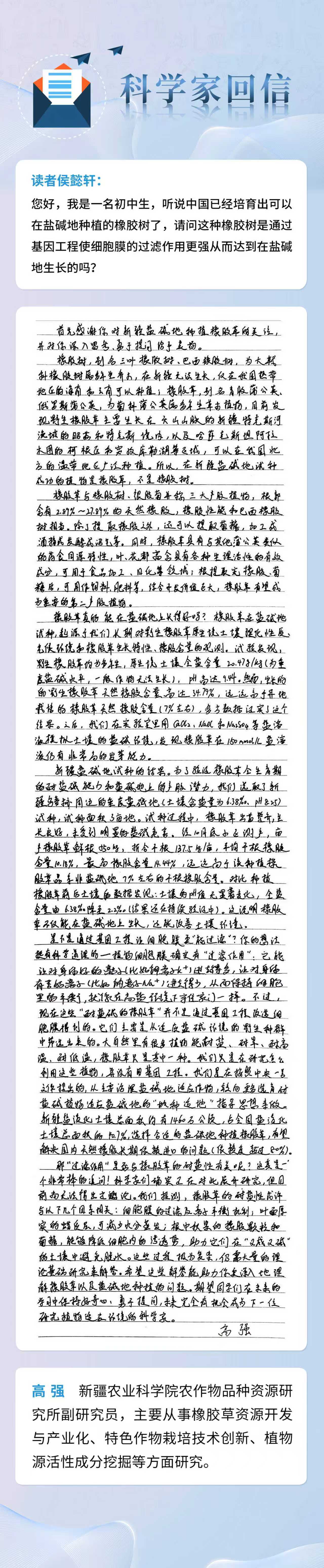读者侯懿轩:您好,我是一名初中生,听说中国已经培育出可以在盐碱地种植的橡胶树了,请问这种橡胶树是通过基因工程使细胞膜的过滤作用更强从而达到在盐碱地生长的目的吗?