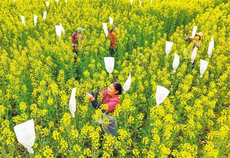 2月24日,重庆市垫江县沙坪镇毕桥村制种油菜基地,工人在给油菜授粉。龚长浩 摄(中经视觉)
