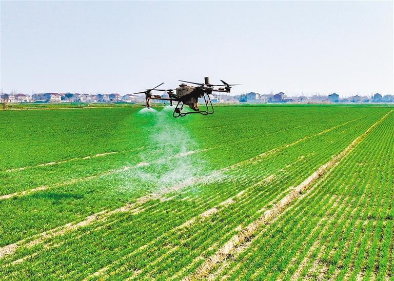 2月18日,江苏省泰州市胡庄镇丁庄村,农业植保无人机进行小麦春季除虫作业。杨玉岗 摄(中经视觉)