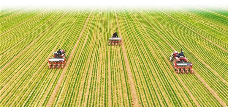 2月25日,山东省聊城市茌平区润土农机专业合作社,农机手驾驶拖拉机进行小麦施肥作业。赵玉国 摄(中经视觉)