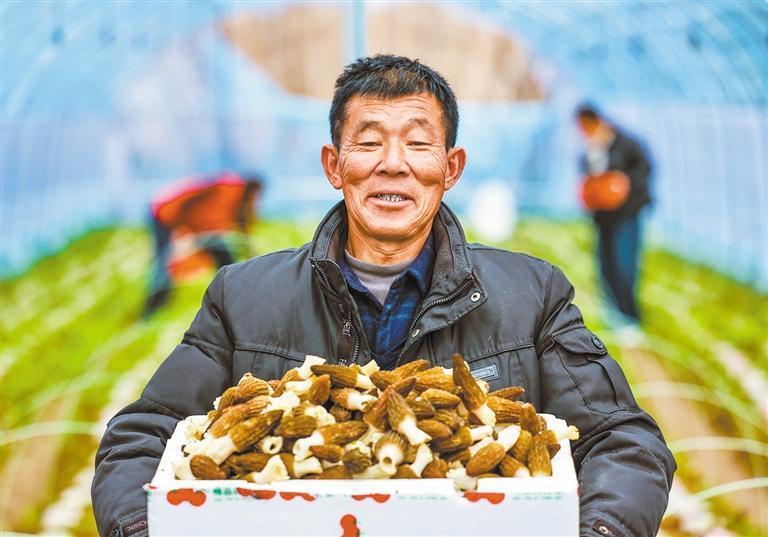 2月25日,安徽省马鞍山市刘山村羊肚菌种植基地,村民在采摘羊肚菌。王文生 摄(中经视觉)