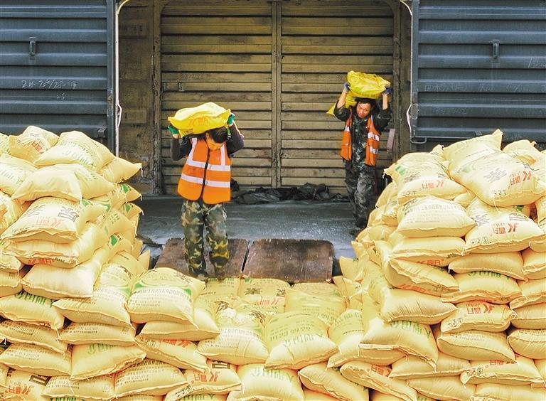 2月25日,江西省南昌向塘铁路货场,工作人员在装卸化肥。胡国林 摄(中经视觉)