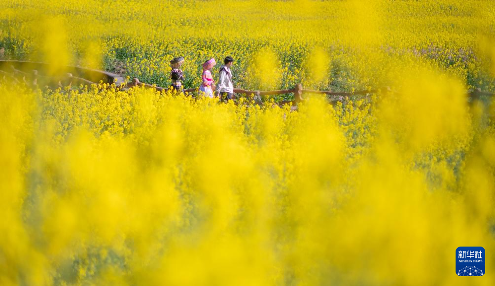 在云南省文山壮族苗族自治州马关县夹寒箐镇上布高村,游人在油菜花海中感受春光。新华社发(熊平祥 摄)