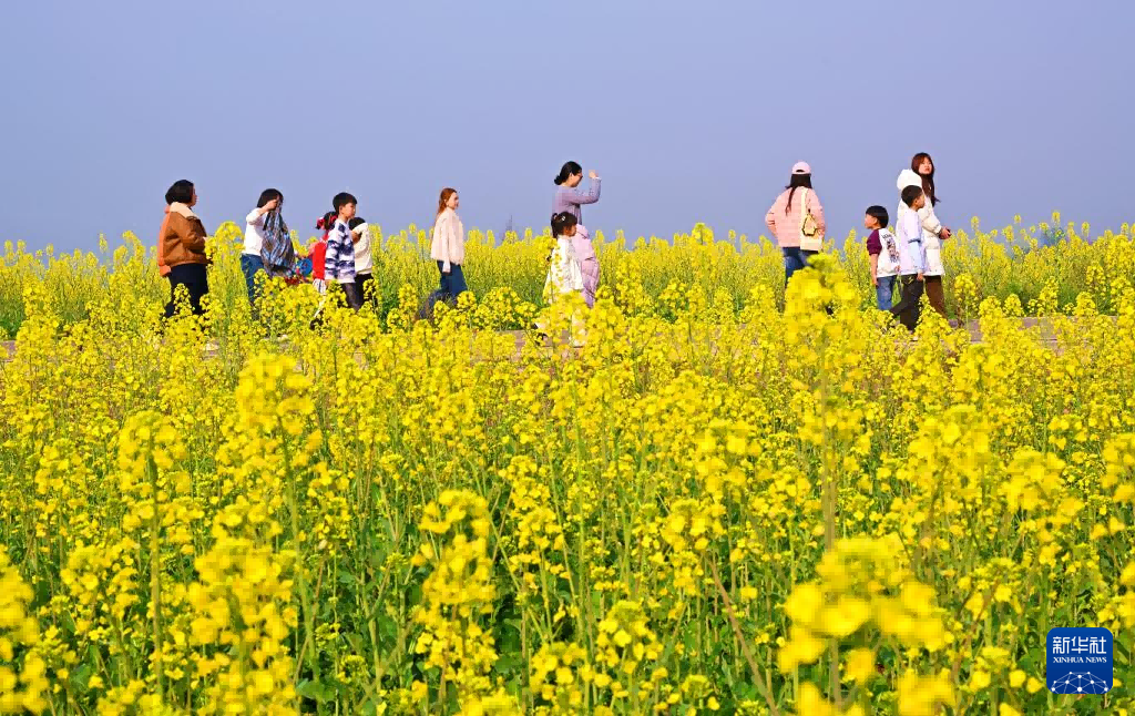 游客在四川省眉山市仁寿县禄加镇天明村的油菜花田间赏花 新华社发(潘建勇 摄)