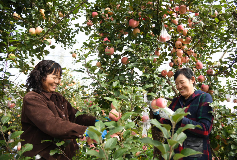 2025年10月17日,果农在陕西省延安市宝塔区桥沟街道烟洞沟村采收苹果。图片来源:新华社